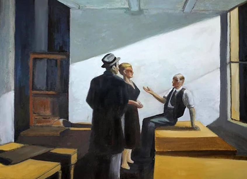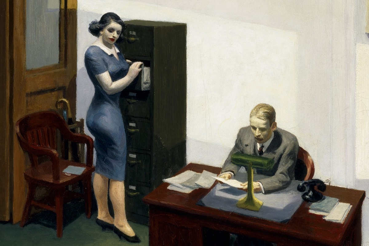처음 이 그림을 봤을 때, 내 손목 워치가 1분도 지나지 않아 차게 식었다. 무채색 사무실 풍경인데도 긴장이 서려 있었다. “불은 켜져 있고, 마음은 꺼져 있다.”
