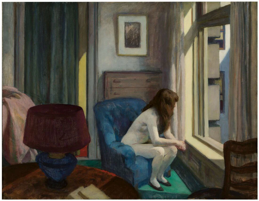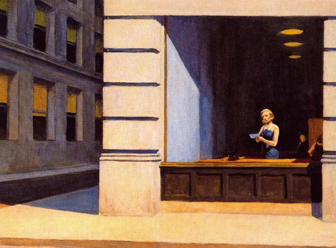 호퍼는 “나는 인물을 그리지 않는다, 빛을 그릴 뿐”이라고 했다. 하지만 그 빛은 감정을 대신 말한다. 노란 전등 아래 엎드린 여인, 낮게 깔린 태양에 잘려 나간 건물의 음영 — 시선은 고정돼 있고, 시간만 느리게 흐른다.